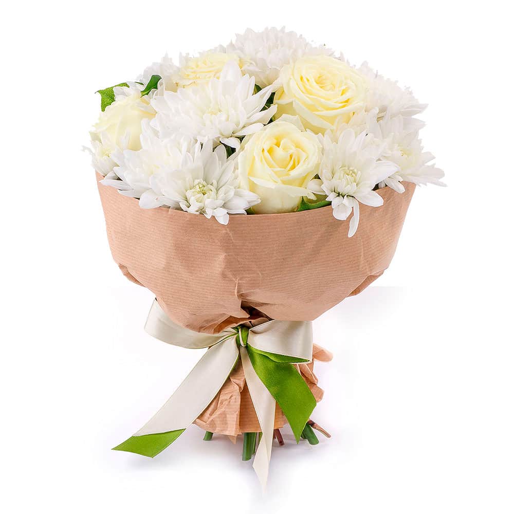 Роза одноголовая белая, хризантема кустовая белая. Упаковка (лента, пленка, крафт, сетка, пленка матовая)