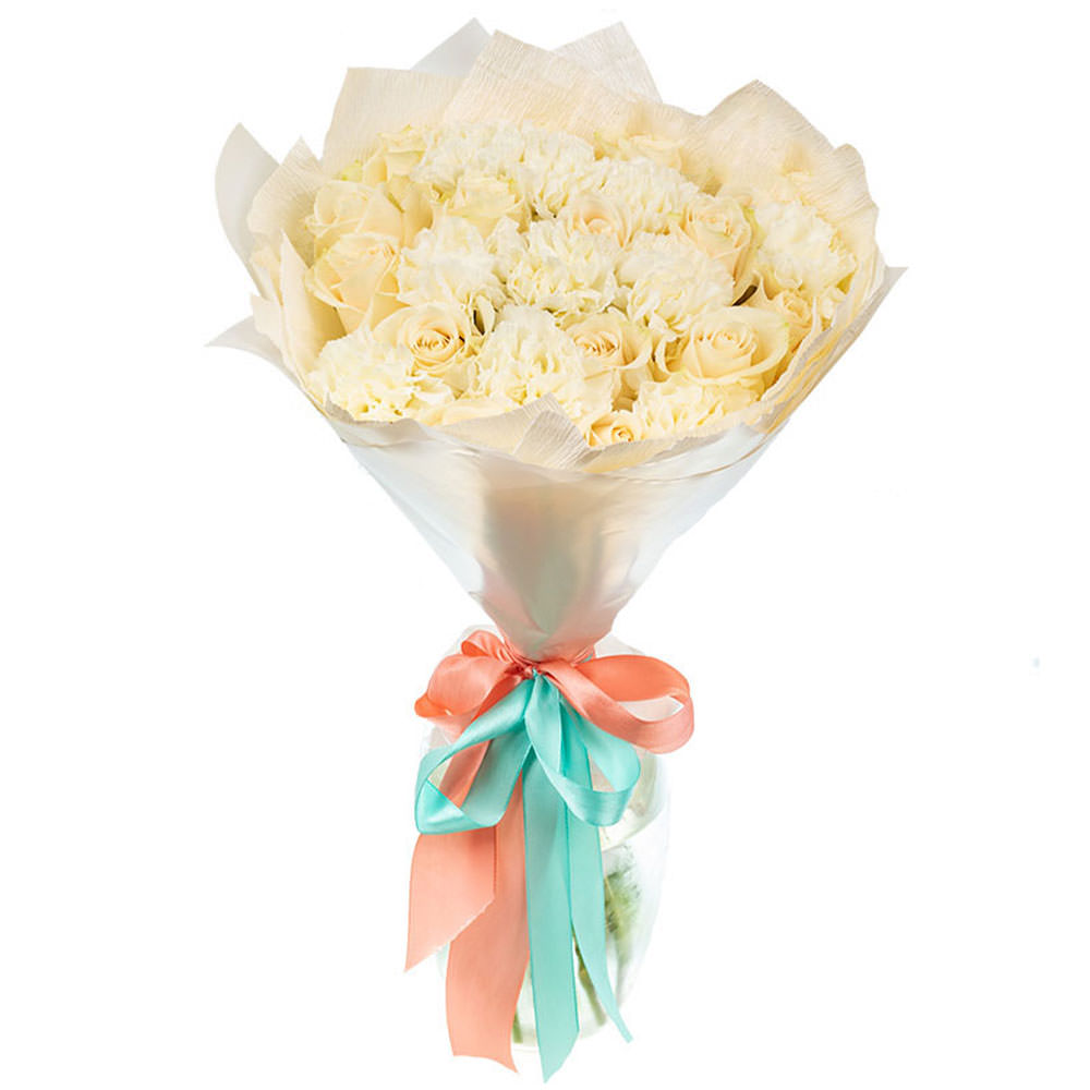 Роза белая, гвоздика белая. Упаковка (лента, пленка, крафт, сетка, пленка матовая)