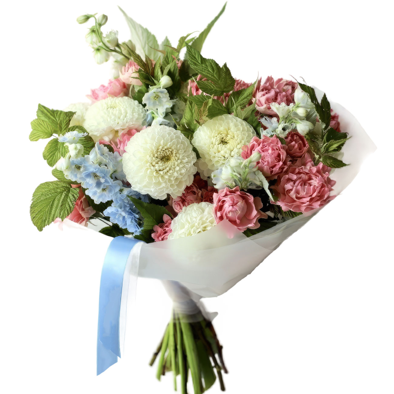 Георгина белая, маттиола голубая, роза кустовая розовая, куст малины. Упаковка (лента, пленка, крафт, сетка, пленка матовая)