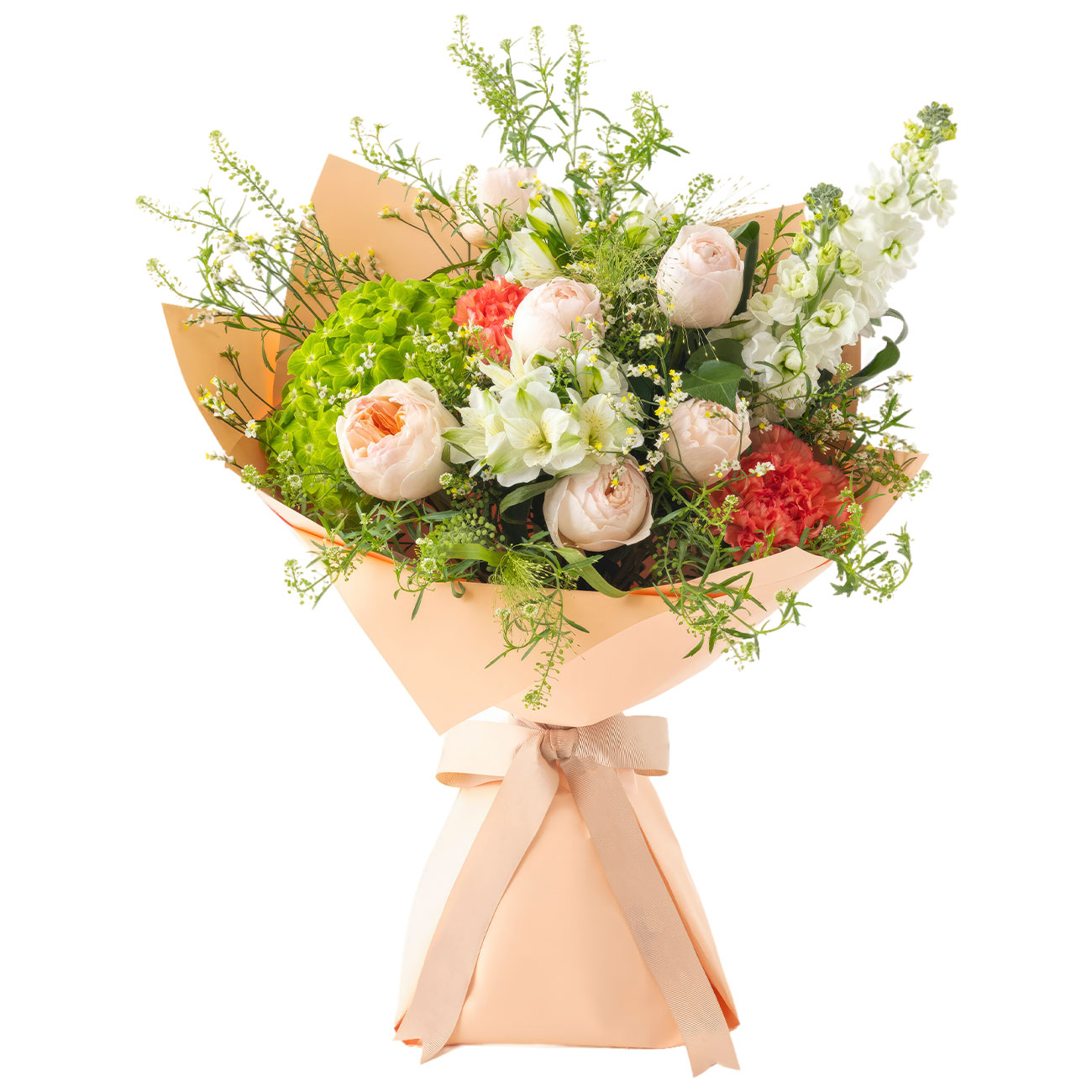 Роза кораллово-розовая кенийская садовая, гортензия зеленая, гвоздика оранжевая, цветок левкоя, альстромерия белая, каспия, тласпи, маттиола белая, зелень. Упаковка (лента, пленка, крафт, сетка, пленка матовая)