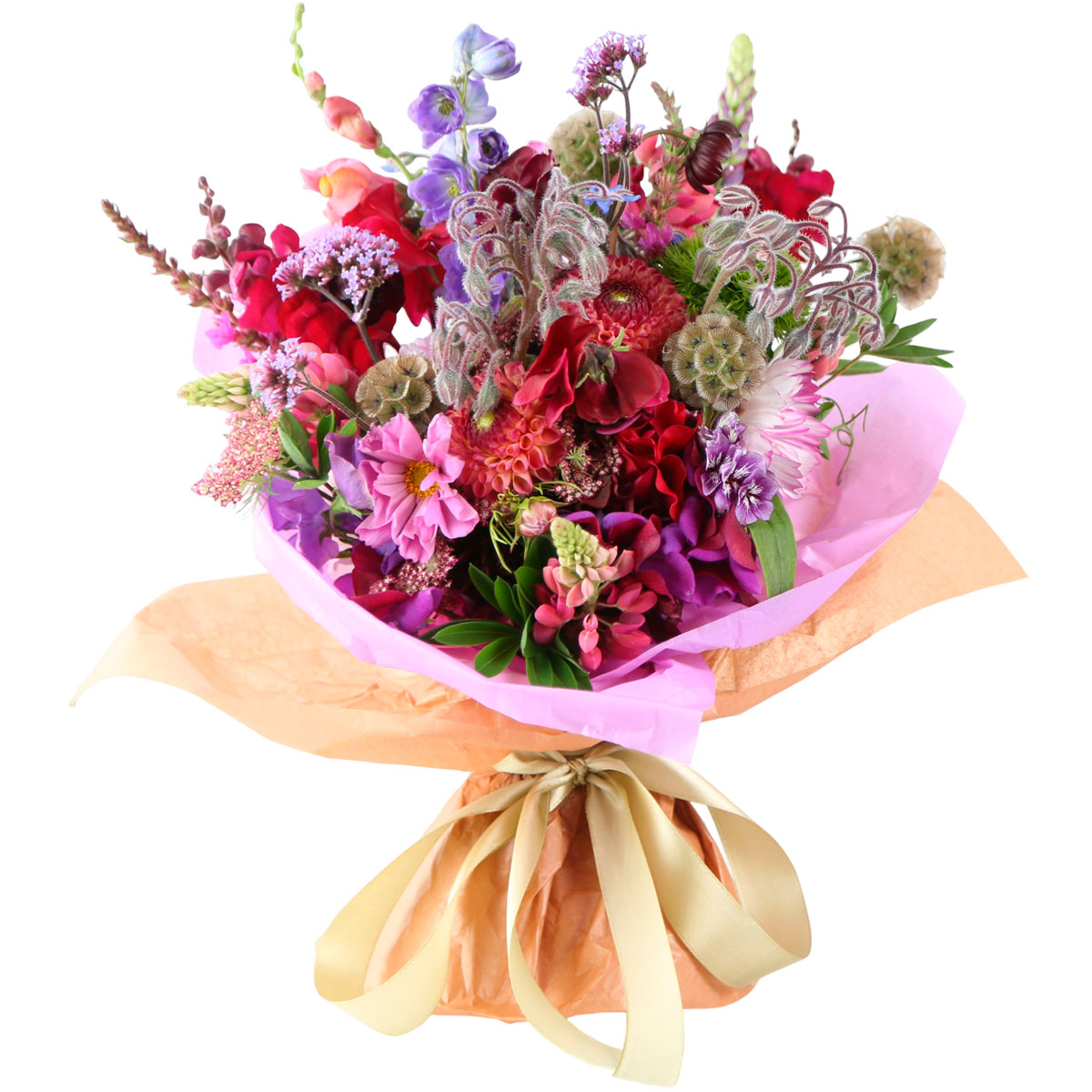 Георгина розовая, люпин, флокс, дельфиниум, фрезия розовая, бораго, статица. Упаковка (лента, пленка, крафт, сетка, пленка матовая)