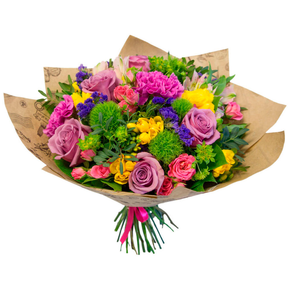Роза одноголовая сиреневая, роза кустовая розовая, фрезия желтая, гвоздика розовая, альстроиерия розовая, статица, зелень. Упаковка (лента, пленка, крафт, сетка, пленка матовая)