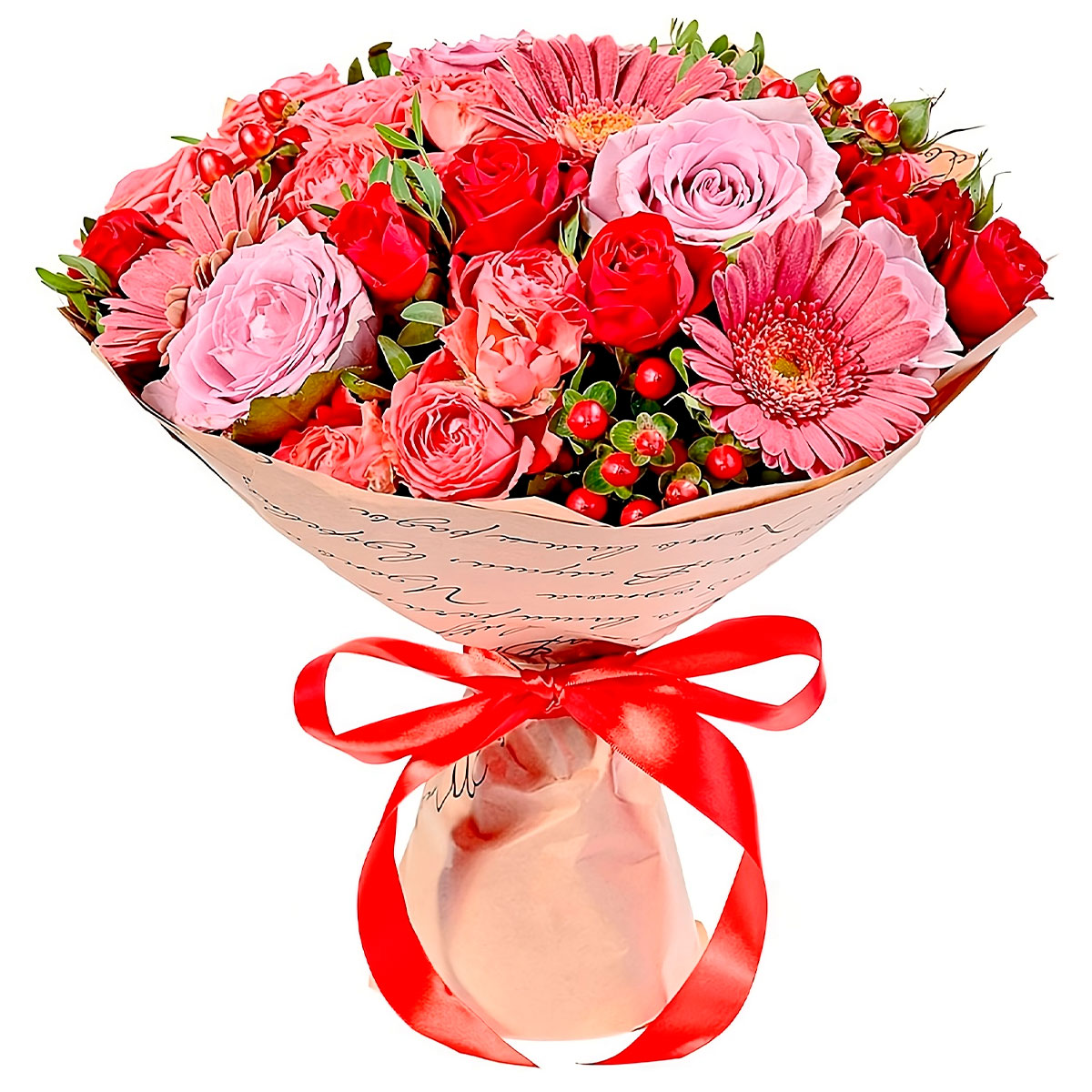 Роза одноголовая красная, роза пионовидная розовая, гербера розовая, гиперикум, фисташка. Упаковка (лента, пленка, крафт, сетка, пленка матовая)