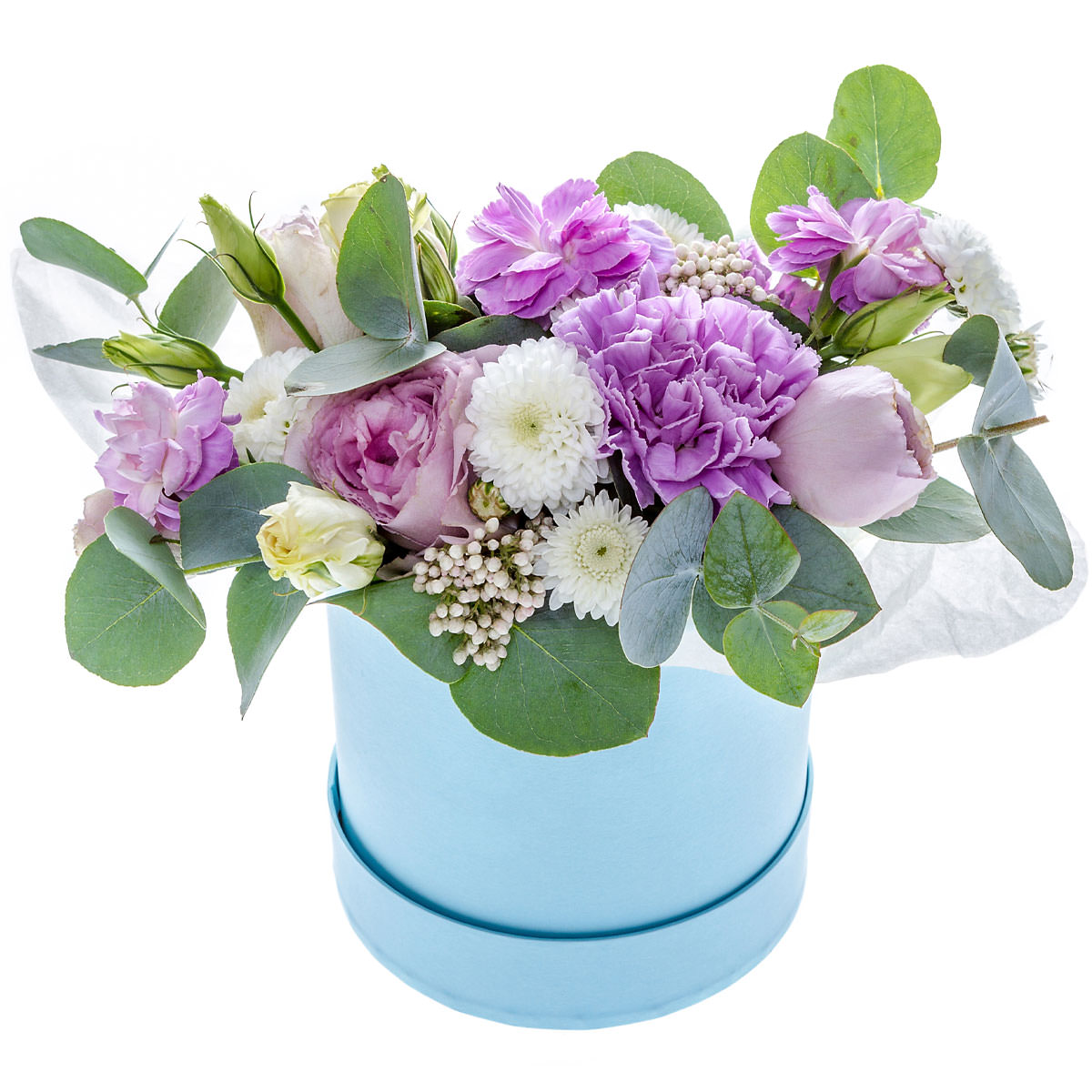 Гвоздика сиреневая, хризантема кустовая белая, роза пионовидная сиреневая, роза кустовая кремовая, маттиола сиреневая, озотамнус, эвкалипт. Упаковка (шляпная коробка, квадратный бокс, коробка сердце, оазис)