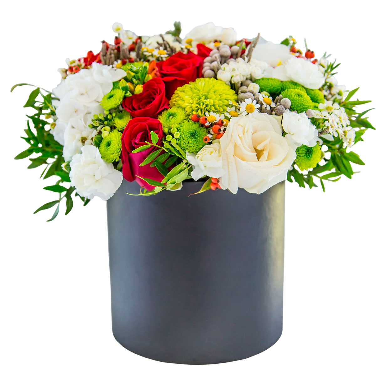 Гортензия белая, роза одноголовая белая и красная, хризантема кустовая зеленая, ваксфлауэр, цинния зеленая, гвоздика кустовая мини белая, бруния, ромашка. Упаковка (шляпная коробка, квадратный бокс, коробка сердце, оазис)