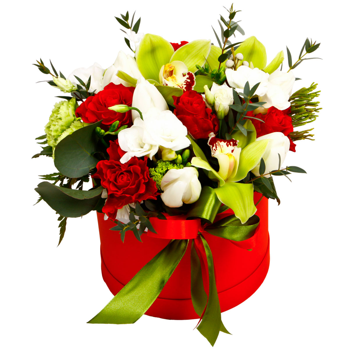 Орхидея желтая, тюльпан белый, гвоздика зеленая, фрезия белая, эустома белая, роза одноголовая красная, бруния, эвкалипт. Упаковка (шляпная коробка, квадратный бокс, коробка сердце, оазис)